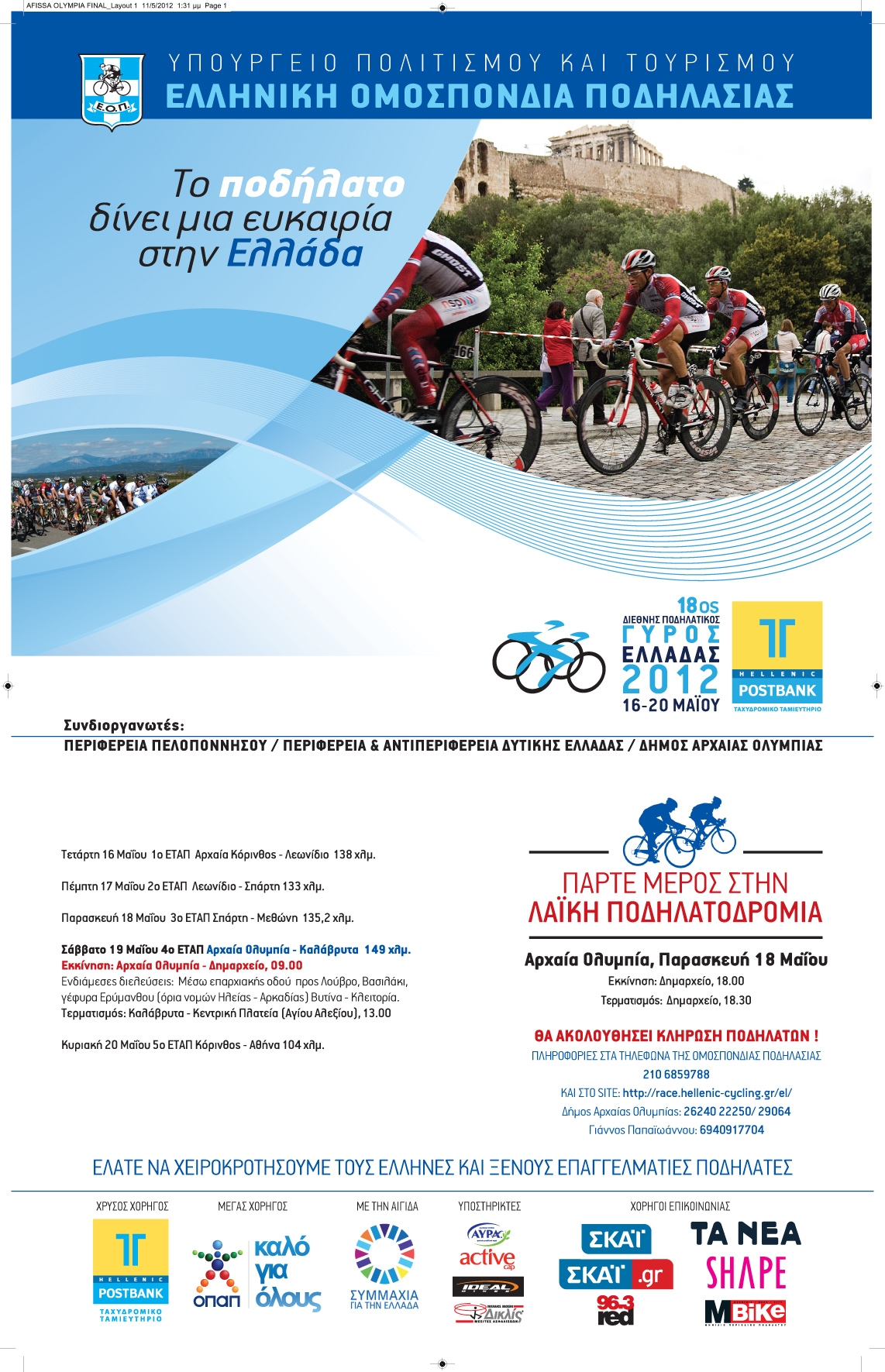 Τον 18ο Διεθνή Ποδηλατικό Γύρο Ελλάδας που διοργανώνεται από την Ελληνική Ομοσπονδία Ποδηλασίας από τις 14 έως τις 20 Μαΐου στηρίζει η Περιφέρεια Δυτικής Ελλάδας συμμετέχοντας στην διοργάνωση του 4ου ΕΤΑΠ το οποίο θα καλύψει την διαδρομή Αρχαία Ολυμπία – Καλάβρυτα, μήκους 149 χιλιομέτρων.