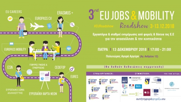 Για τα προνόμια της κινητικότητας σε επίπεδο σπουδών, πρακτικής άσκησης, εργασίας, αλλά και επιχειρηματικής δραστηριότητας, θα έχουν τη δυνατότητα να ενημερωθούν οι ενδιαφερόμενοι, στο πλαίσιο του «3ου EU Jobs and Mobility Roadshow», που έχει προγραμματιστεί από το Europe Direct Patras της Περιφέρειας Δυτικής Ελλάδας και θα πραγματοποιηθεί την Πέμπτη 13 Δεκεμβρίου 2018, στην «Αγορά Αργύρη» στην Πάτρα.