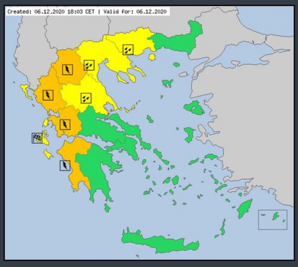 - Από τις βραδινές ώρες της Κυριακής (06-12-2020) τα νησιά του Ιονίου και από αργά τη νύχτα η Ήπειρος, η δυτική Μακεδονία, η δυτική Στερεά και η δυτική Πελοπόννησος. Στις περιοχές αυτές τα φαινόμενα θα εξασθενήσουν από το μεσημέρι της Δευτέρας (07-12-2020).