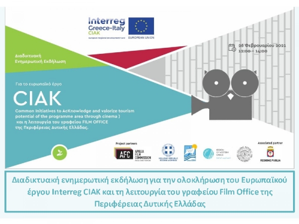 Η Περιφέρεια Δυτικής Ελλάδας διοργανώνει ενημερωτική εκδήλωση, στο πλαίσιο ολοκλήρωσης του ευρωπαϊκού έργου Interreg: «CIAK: Common Initiatives to AcKnowledge and valorize tourism potential of the programme area through cinema» του προγράμματος Ευρωπαϊκή Εδαφική Συνεργασία Interreg Greece - Italy 2014-2020.