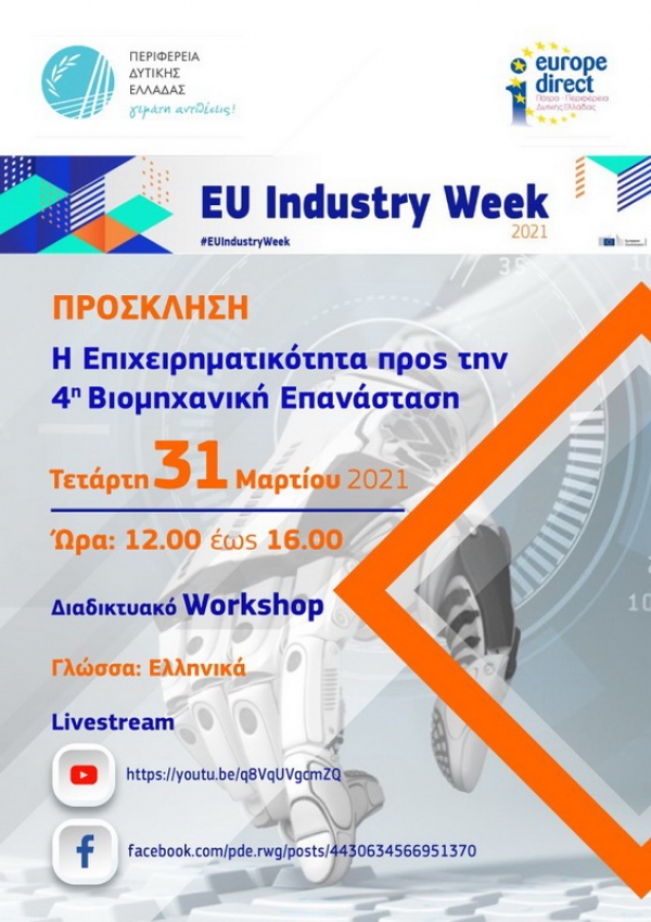 Στο πλαίσιο αυτό η Περιφέρεια Δυτικής Ελλάδας διοργανώνει με την αρωγή του Europe Direct Patra διαδικτυακό workshop με τίτλο: «Η Επιχειρηματικότητα προς την 4η Βιομηχανική Επανάσταση», την Τετάρτη 31 Μαρτίου 2021 και ώρα 12.00 - 16.00. Το διαδικτυακό workshop θα αποτελείται από τις εξής συνεδρίες: