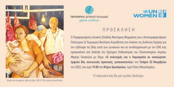 Ο Περιφερειάρχης Δυτικής Ελλάδας, Νεκτάριος Φαρμάκης και ο Αντιπεριφερειάρχης Πολιτισμού και Τουρισμού, Νικόλαος Κοροβέσης, σε συνεργασία  με τον Οργανισμό Ηνωμένων Εθνών και στο πλαίσιο της Διεθνούς Ημέρας για την εξάλειψη της Βίας κατά των γυναικών, διοργανώνουν διάλεξη με κεντρική ομιλήτρια την Ομότιμη Καθηγήτρια του Πανεπιστημίου Αιγαίου, Μαρία Γκασούκα, με θέμα «Ο πολιτισμός και η δημοκρατία σε υποχώρηση: έμφυλη βία, κοινωνικές πρακτικές, γυναικοκτονίες». Η εν λόγω διάλεξη  θα πραγματοποιηθεί  την Τετάρτη  στις  23 Νοεμβρίου του 2022 και ώρα 19:00 στο Κτίριο Χρυσόγελου, στην Ιερή Πόλη Μεσολογγίου.