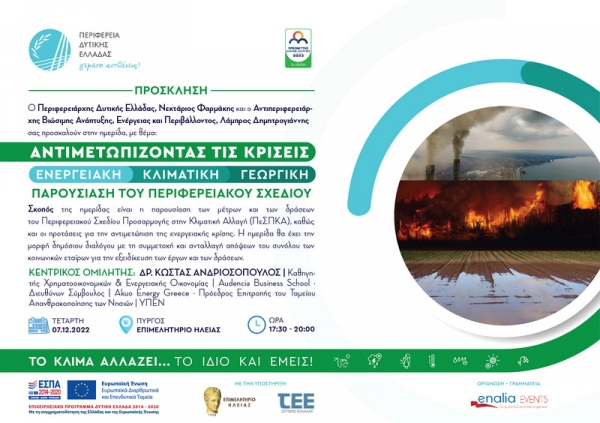 Τα μέτρα και οι δράσεις του Περιφερειακού Σχεδίου Προσαρμογής στην Κλιματική Αλλαγή (ΠεΣΠΚΑ) καθώς και οι προτάσεις για την αντιμετώπιση της ενεργειακής κρίσης παρουσιάζονται σε ημερίδα που πραγματοποιεί η Περιφέρεια Δυτικής Ελλάδας και ο Αντιπεριφερειάρχης Βιώσιμης Ανάπτυξης, Ενέργειας και Περιβάλλοντος, Λάμπρος Δημητρογιάννης.