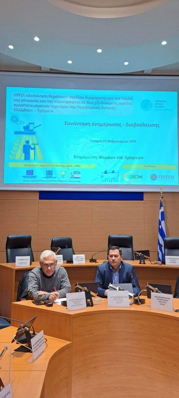 Η πιλοτική προσέγγιση της σύνδεσης της αγροτικής δραστηριότητας (γεωργία και κτηνοτροφία) με τη βιοποικιλότητα απασχόλησε την ενημερωτική συνάντηση-διαβούλευση  που διοργάνωσε η ένωση εταιρειών «ΟικοΜ ΕΠΕ - NERCO ΑΕΜ» σε συνεργασία με τη Διεύθυνση Αγροτικής Οικονομίας της Περιφέρειας Δυτικής Ελλάδας, στο πλαίσιο του έργου «Εκπόνηση Θεματικών Σχεδίων Διαχείρισης για τον τομέα της γεωργίας και της κτηνοτροφίας σε επιλεγμένες προστατευόμενες περιοχές της Περιφέρειας Δυτικής Ελλάδας».