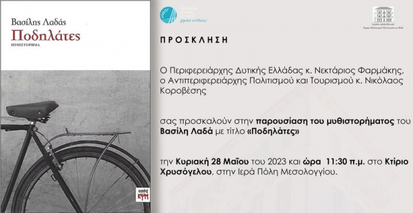 Ο Περιφερειάρχης Δυτικής Ελλάδας, Νεκτάριος Φαρμάκης, ο Αντιπεριφερειάρχης Πολιτισμού και Τουρισμού, Νικόλαος Κοροβέσης σας προσκαλούν σε συνεργασία με τις «Εκδόσεις ΚΨΜ» στην παρουσίαση του μυθιστορήματος του Βασίλη Λαδά με τίτλο: «Ποδηλάτες», την Κυριακή στις 28 Μαΐου 2023 και ώρα 11:30 π.μ. στο Κτίριο Χρυσόγελου, στο Μεσολόγγι.