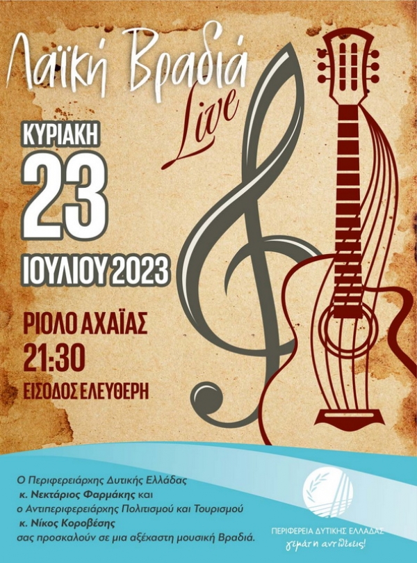 Η Περιφέρεια Δυτικής Ελλάδας και ο Αντιπεριφερειάρχης Πολιτισμού και Τουρισμού, Νικόλαος Κοροβέσης, σας προσκαλούν στη μουσική παράσταση: «Λαϊκές διαδρομές», την Κυριακή 23 Ιουλίου 2023 και ώρα 21:30 στο Ριόλο, του Δήμου Δυτικής Αχαΐας. Το μουσικό σχήμα «Λαϊκές διαδρομές» είναι ένα ιδιαίτερο τοπικό συγκρότημα με εμφανίσεις σε όλη την Περιφερειακή Ενότητα Αχαΐας και όχι μόνο.