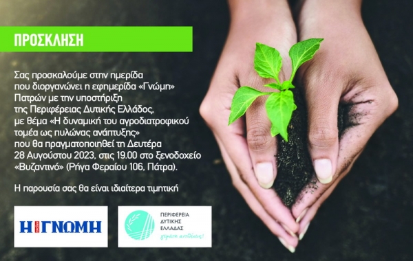 Η Περιφέρεια Δυτικής Ελλάδας σε συνεργασία με την εφημερίδα «Γνώμη», διοργανώνουν ημερίδα με τίτλο "Η δυναμική του αγροδιατροφικού κλάδου ως πυλώνας ανάπτυξης" που θα πραγματοποιηθεί τη Δευτέρα 28 Αυγούστου 2023 και ώρα 19:00 στο Ξενοδοχείο Βυζαντινό στην Πάτρα.
