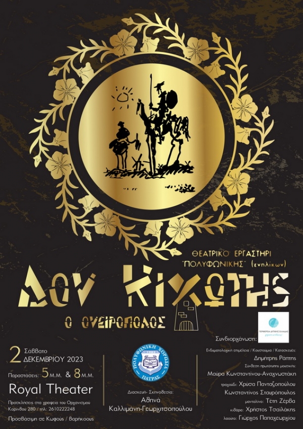 Η Περιφέρεια Δυτικής Ελλάδας σε συνεργασία με το θεατρικό εργαστήρι της Πολυφωνικής Χορωδίας της Πάτρας διοργανώνει την μουσικοθεατρική παράσταση "Δον Κιχώτης, ο Ονειροπόλος", που θα παρουσιαστεί στο θέατρο Royal στην Πάτρα, το Σάββατο 2 Δεκεμβρίου 2023 στις 5:00 το απόγευμα και στις 8.00 το βράδυ.