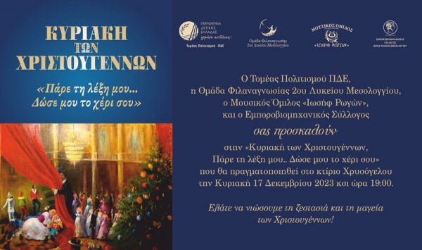 Η παρουσία σας στην εκδήλωση με τίτλο: "Κυριακή των Χριστουγέννων. Πάρε τη λέξη μου… Δώσε μου το χέρι σου» στο Κτίριο Χρυσόγελου" την Κυριακή στις 17 Δεκεμβρίου 2023 και ώρα 19:30 θα μας τιμήσει ιδιαίτερα και θα ενισχύσει τη δύναμη των λέξεων που έρχονται ως αντίδωρα στις ημέρες των Χριστουγέννων.