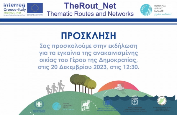 Στο πλαίσιο ολοκλήρωσης του διακρατικού ευρωπαϊκού έργου TheRout_Net, θα πραγματοποιηθεί εκδήλωση για τα εγκαίνια της ανακαινισμένης οικίας του «Γέρου της Δημοκρατίας», Γεωργίου Παπανδρέου, την Τετάρτη  20 Δεκεμβρίου 2023, στις 12:30, στο Καλέντζι Αχαΐας.