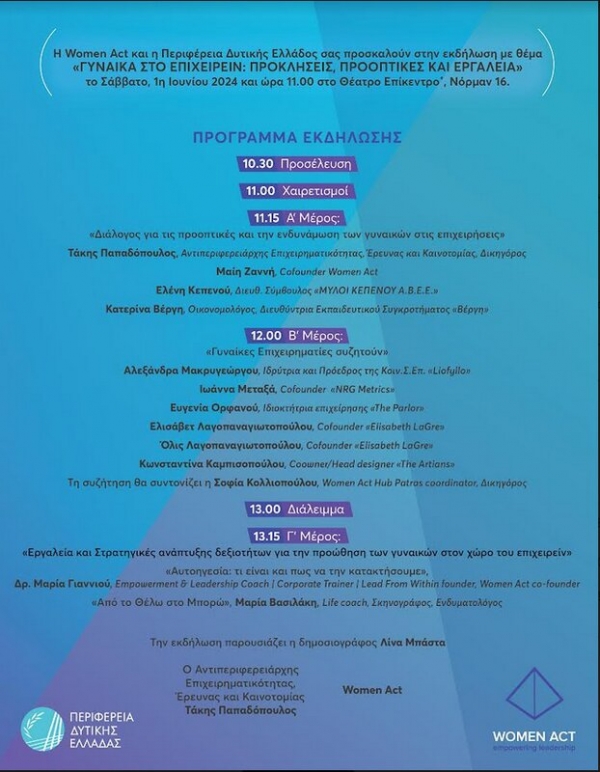 - 13.15 Γ’ Μέρος: «Εργαλεία και Στρατηγικές ανάπτυξης δεξιοτήτων για την προώθηση των γυναικών στον χώρο του επιχειρείν» "Αυτοηγεσία: τι είναι και πως να την κατακτήσουμε", - - Δρ Μαρία Γιαννιού, Empowerment & Leadership Coach | Corporate Trainer | Lead From Within founder, Women Act co-founder «Από το Θέλω στο Μπορώ»,