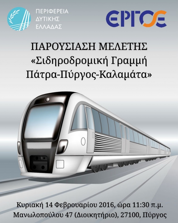 Με ανοικτή εκδήλωση στον Πύργο Ηλείας θα παρουσιάσουν η Περιφέρεια Δυτικής Ελλάδας και η ΕΡΓΟΣΕ, τη μελέτη για τη «Σιδηροδρομική Γραμμή Πάτρα-Πύργος-Καλαμάτα» στους φορείς και τους πολίτες της περιοχής.