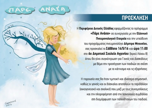Σε Δημοτικά Σχολεία στις Περιφερειακές Ενότητες Αιτωλοακαρνανίας και Ηλείας συνεχίζεται το μήνα Μάιο το πρόγραμμα «Πάρε Ανάσα» για την πρόληψη του καπνίσματος που υλοποιεί η Περιφέρεια Δυτικής Ελλάδας.