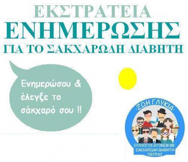 Η Διεύθυνση Δημόσιας Υγείας της Περιφέρειας Δυτικής Ελλάδας σε συνεργασία με τον Σύλλογο Διαβητικών «ΓΛΥΚΙΑ ΖΩΗ», οργανώνουν από την ερχόμενη Δευτέρα 12 Ιουνίου, μία εβδομάδα ενημέρωσης και προληπτικών εξετάσεων για τον σακχαρώδη διαβήτη.