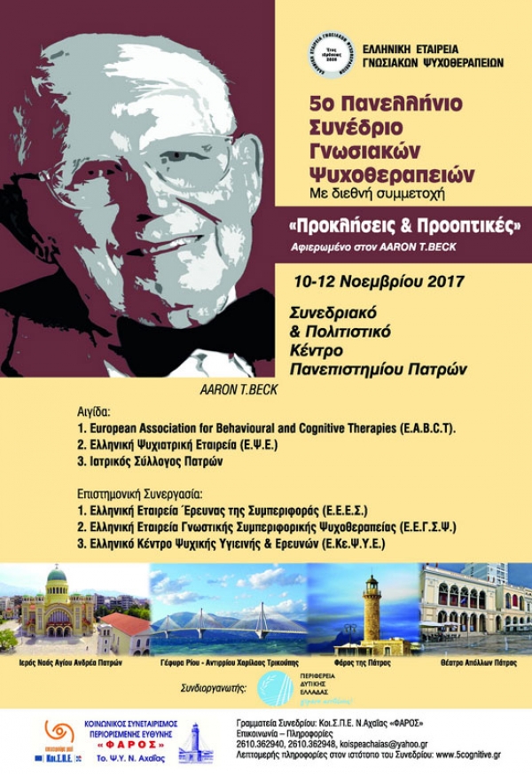 Η Περιφέρεια Δυτικής Ελλάδας σε συνεργασία με την Ελληνική Εταιρεία Γνωσιακών Ψυχοθεραπειών (Ε.Ε.Γ.Ψ.) και τη συνδιοργάνωση του ΚΟΙ.Σ.Π.Ε.« Φάρος» και του Κέντρου Ψυχικής Υγιεινής Πάτρας οργανώνουν το 5ο Πανελλήνιο Συνέδριο Γνωσιακών Ψυχοθεραπειών με θέμα: «Γνωσιακή Ψυχοθεραπεία: Προκλήσεις & Προοπτικές», που φέτος φιλοξενείται στην πόλη των Πατρών, στο Συνεδριακό Κέντρο του Πανεπιστημίου Πατρών στις 10-12 Νοεμβρίου 2017.