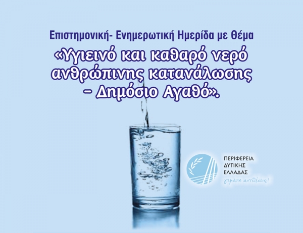 H Περιφέρεια Δυτικής Ελλάδας διοργανώνει δύο ημερίδες με θέμα «Υγιεινό και καθαρό νερό ανθρώπινης κατανάλωσης – Δημόσιο Αγαθό», στις οποίες θα παρουσιαστούν ομιλίες σχετικά με την αναγκαιότητα το νερό να παραμείνει δημόσιο αγαθό. Αναφορά θα γίνει στις τελευταίες αλλαγές στη νομοθεσία.