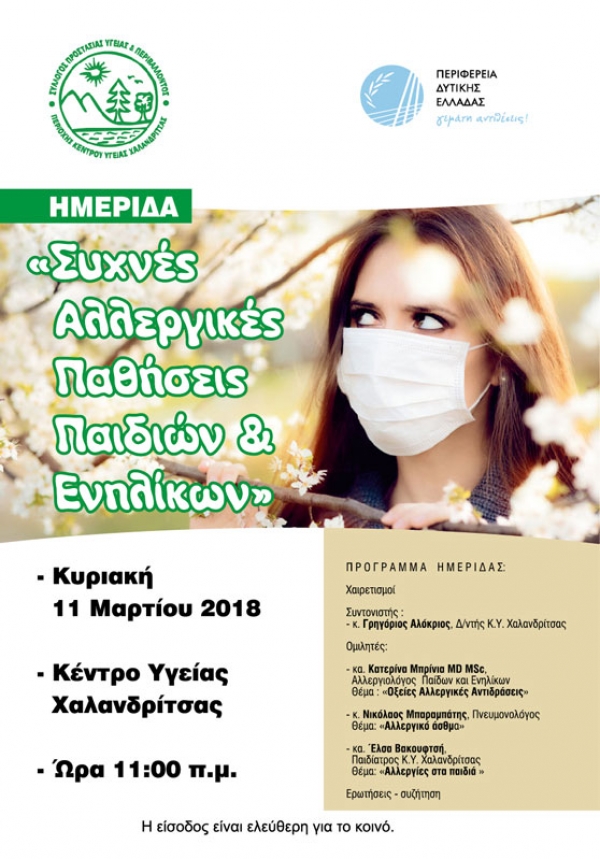 Με στόχο την ενημέρωση των πολιτών σχετικά με τις αλλεργίες και στο πλαίσιο του Σχεδίου Δράσης για την πρόληψη, ευαισθητοποίηση και προαγωγή της υγείας των πολιτών της Περιφέρειας Δυτικής Ελλάδας για το 2018, η Περιφέρεια Δυτικής Ελλάδας διοργανώνει σε συνεργασία με το Σύλλογο Προστασίας Υγείας και Περιβάλλοντος Περιοχής Κέντρου Υγείας Χαλανδρίτσας και το Κέντρο Υγείας Χαλανδρίτσας ημερίδα με θέμα «Συχνές Αλλεργικές Παθήσεις Παιδιών και Ενηλίκων» .