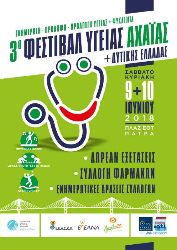 Η Περιφέρεια Δυτικής Ελλάδας σε συνεργασία με τους φορείς «ΑΓΚΑΛΙΑ-ΖΩ», «ΕΛ.Ε.Α.Ν.Α.», Ε.Ε.Π.Σ.Κ, την Εταιρεία «Γέφυρα Ρίου-Αντιρρίου Α.Ε. , την Ένωση Κοινωνικών Φορέων «ΠΥΛΩΝΕΣ ΑΛΛΗΛΕΓΓΥΗΣ – ΚΩΣΤΗΣ ΣΤΕΦΑΝΟΠΟΥΛΟΣ» και το Κέντρο Εκπαιδευτικών Δράσεων του Δήμου Πατρέων οργανώνουν το Σάββατο 9 Ιουνίου και την Κυριακή 10 Ιουνίου 2018 το 3ο Φεστιβάλ Υγείας στην πλαζ ΕΟΤ, στην Πάτρα, με τη συμμετοχή σωματείων και συλλόγων της Δ. Ελλάδας.